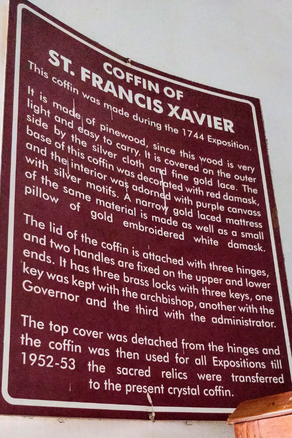 On the southern side in the transept is a chapel with gilded twisted columns and floral decorations of wood, where the sacred relics of the body of St. Francis Xavier are kept.
