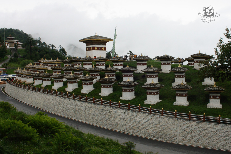 The Dochula Pass is a mountain pass on the road from Thimphu to Punakha. Built on a central hillock at the pass are 108 red-band memorial Chortens or Stupas known as “Druk Wangyal Chortens”.