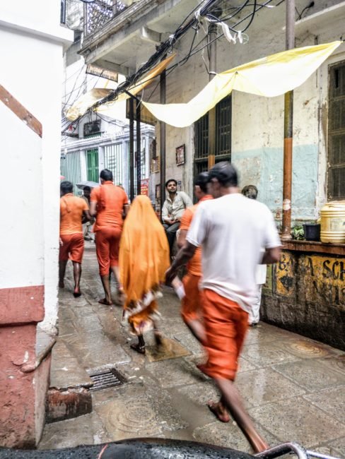 This was the season of “kanwaryas” or Shiv Bhakts, pilgrims traveling barefoot in saffron robes with their Kanwars (walking sticks used to hang urns of Ganga water). The city was bursting with Kanwars and although I would surely avoid a Kanwar crowd in Delhi, I felt completely calm in the Kanwar throng at Banaras.