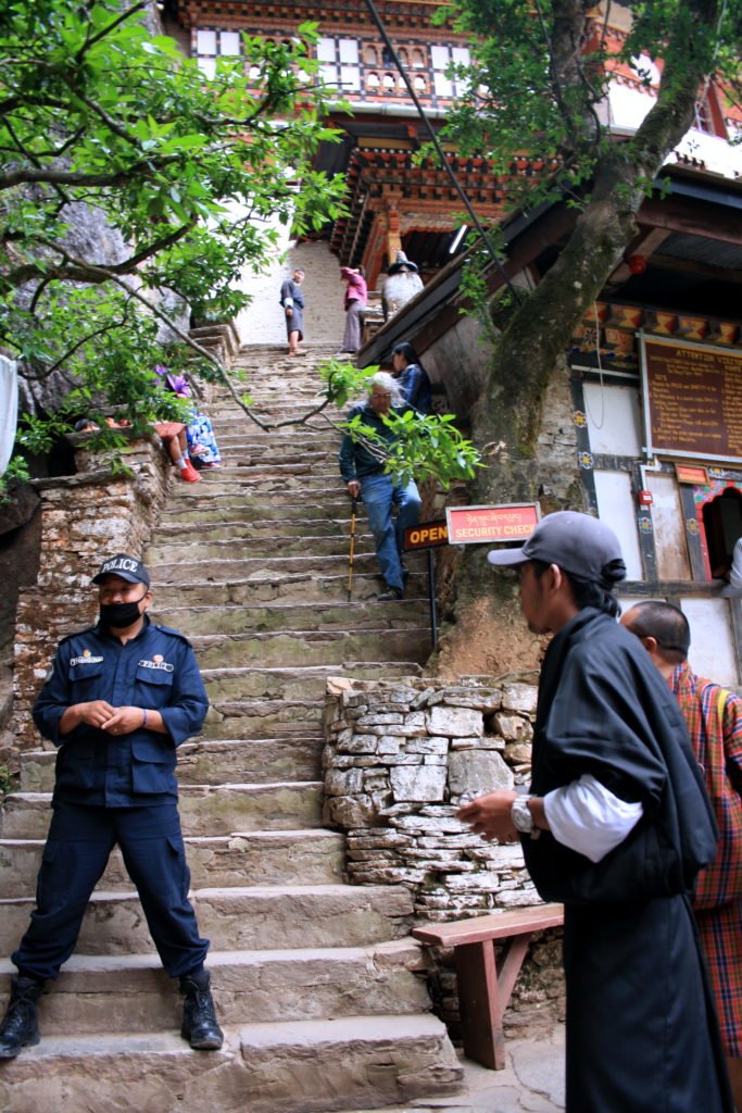 On reaching the Tiger’s Nest Indian tourists can be seen registering their tickets.