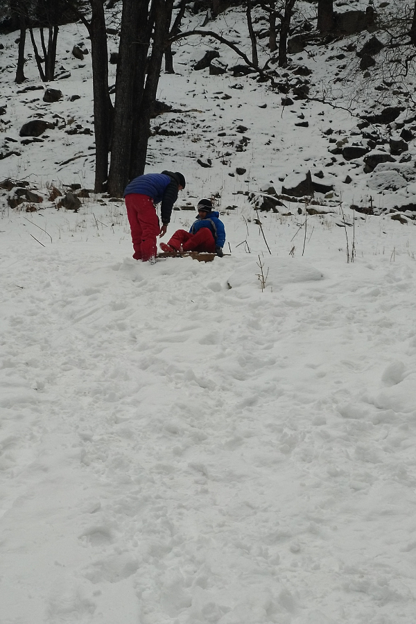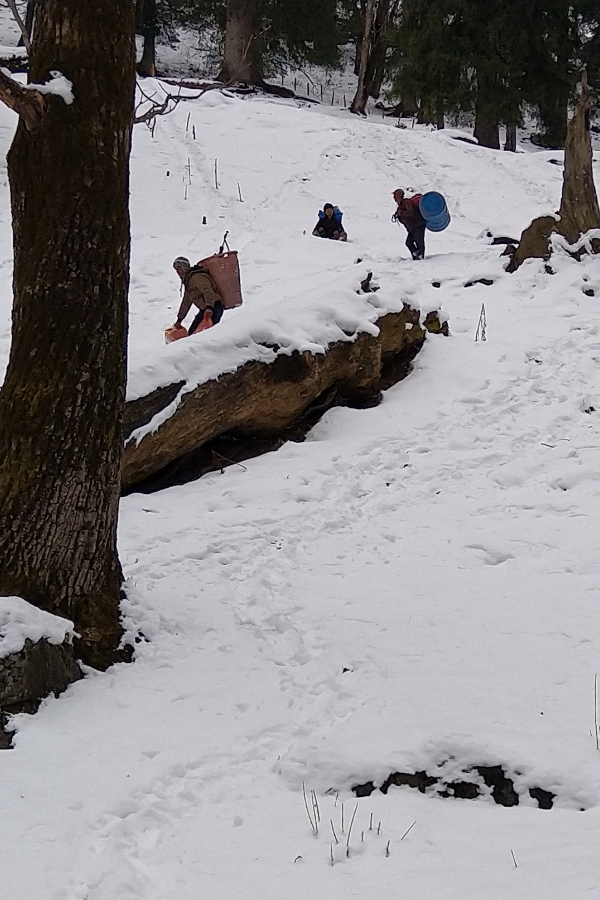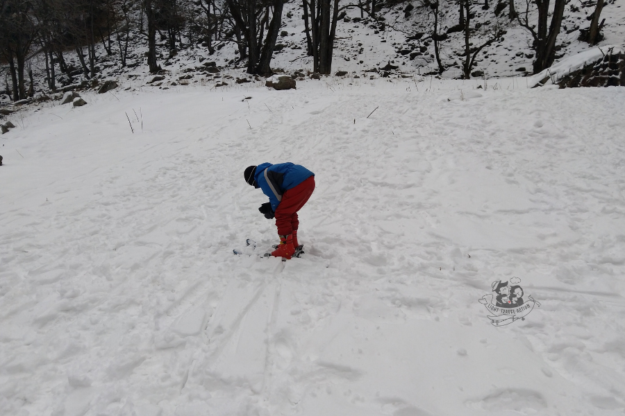 The fresh snow was very soft and though my son found it little difficult to walk through we thoroughly enjoyed our “little snow trek”. Our guide had a basket in which he kept our bags and hung it on his back.