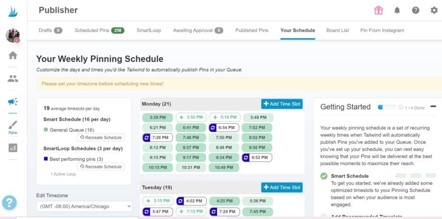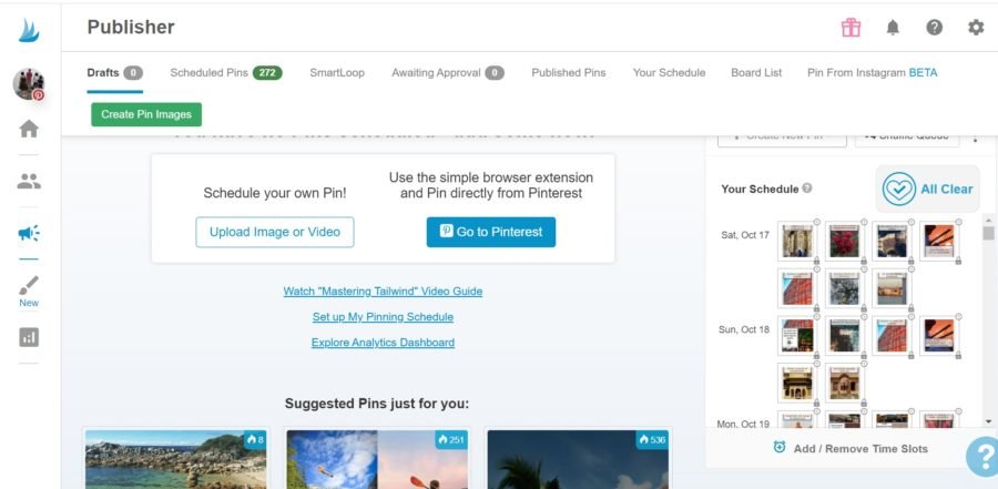 Weekly Pinning Schedule shows the best times when Tailwind would automatically publish the pins added to the queue. It chooses the best possible moments to maximise the reach. It shows the optimized time slots in the schedule when  your audience is most engaged. So you need not worry about choosing the best time as Tailwind takes care of that.