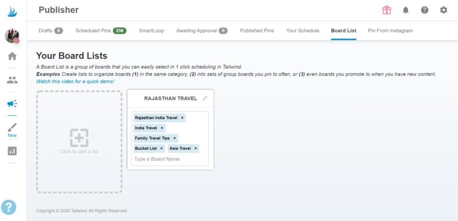 Boards Lists are very helpful and time saving. When you are scheduling a Pin, instead of manually entering the name of every board, you can just select the Board list and the Pin will be scheduled to all the boards in the list.